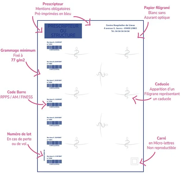 Les professionnels de santé prescripteurs (médecins, chirurgiens-dentistes et sages-femmes) doivent commander ces ordonnances auprès d’un imprimeur agréé Afnor.